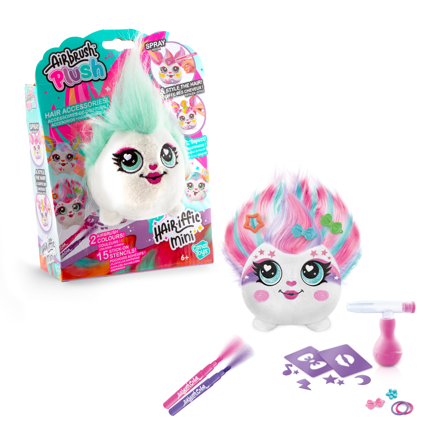 Airbrush kreativní sada Hair’iffic s plyšákem s dlouhými vlasy.