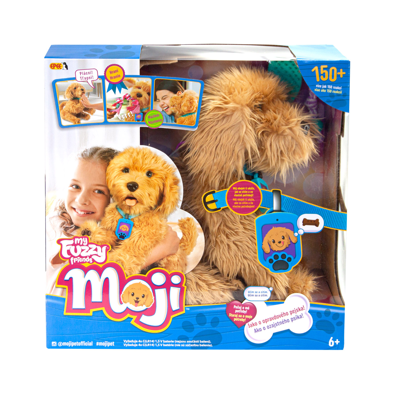 Interaktivní pejsek Moji je mazlivé štěňátko, které má hebkou srst a roztomilý výraz. Reaguje jako skutečný pejsek na hlasové povely a dotek více než 150 unikátními reakcemi. Můžete ho naučit 10 psích triků a užít si s ním spoustu zábavy. Kolem krku má navíc speciální chytrý obojek s displejem, na kterém se zobrazují jeho potřeby a nálady. Na ty je možné vedle hlasových povelů a dotyku reagovat také pomocí speciálních kartiček „péče“ a zajistit tak, aby měl Moji vše co potřebuje.